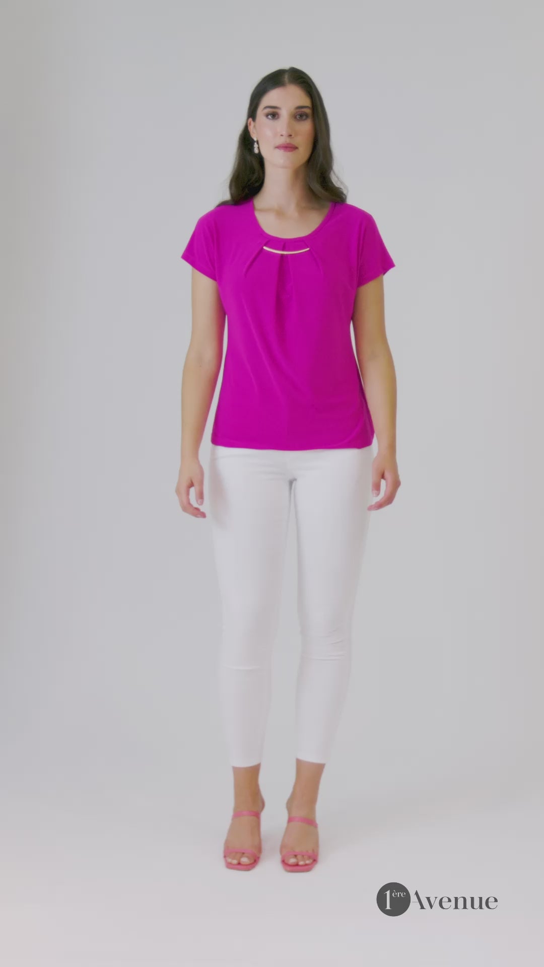 The scoop neckline adds a touch of elegance, framing your collarbones beautifully. It's a versatile choice that transitions seamlessly from day to night. Adorned with delicate pleating and a curved metal bar, this top exudes sophistication. The subtle shine from the metal detail catches the light, making it a standout piece.