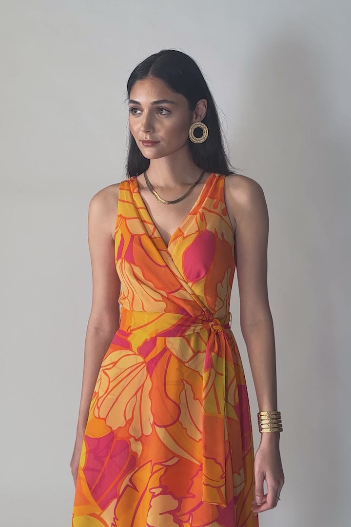 Adorned with a vibrant tropical print, this chiffon dress is the epitome of feminine style. The wrap neckline and sash at the waist pair perfectly to elevate the piece’s fit and flare silhouette. The high-low hem adds movement to inject grace and elegance to every step.